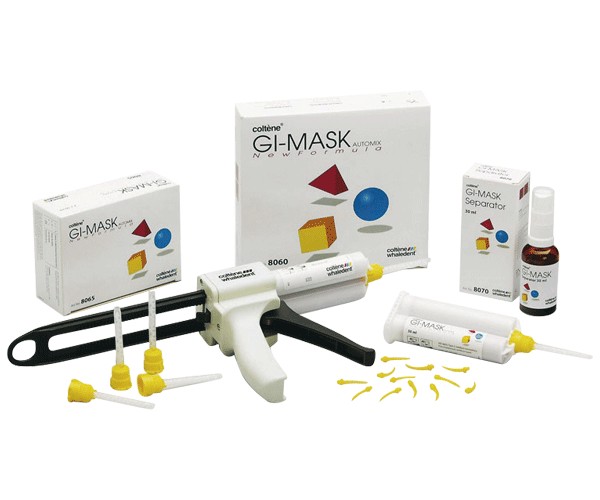Condensation-curable polysiloxane for the precise rapid reconstruction of gingiva on the plaster model for individual crowns, bridges, implants, combined work, and telescopic restorations. CONTENT: - 2 x GI-MASK Automix NF cartridge (50 ml.) - Yellow Mixing Tips (12 pcs.) - Yellow Oral Tips (12 pcs.)