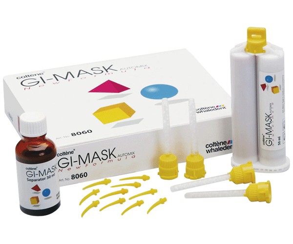 Polisiloxano reticulável por condensação para a reconstrução rápida e exata da gengiva sobre o modelo de gesso para coroas individuais, pontes, implantes, trabalhos combinados e telescópicos. CONTEÚDO: - 2 x cartuchos GI-MASK automix NF (50 ml). - 1 x separador GI-MASK (30 ml). - Pontas de mistura amarelas (12 unid.). - Pontas orais amarelas (12 unid.).