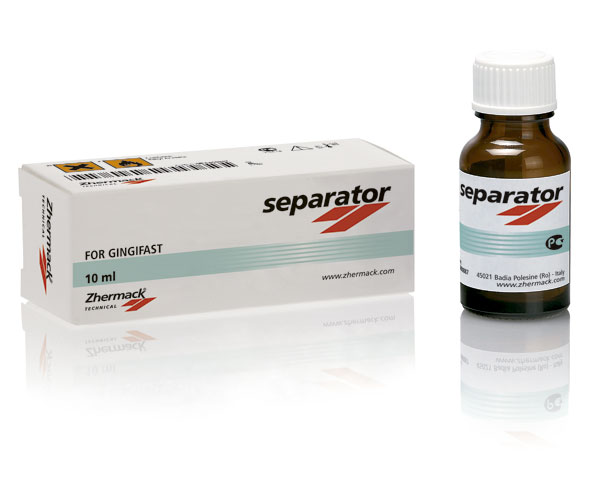 The Gingifast Separator by Zhermack is a ready-to-use solution that allows for isolation between surfaces of the same material, preventing adhesion. It facilitates isolation between surfaces of similar materials and avoids their adhesion. Used for gingival reproductions.