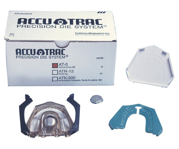 Precision system for removable stumps without pins. Simple, fast, and effective. CONTENTS: 6 complete ACCU-TRAC molds + 6 bases for pouring and ejection + 6 spacers for articulation + 25 metal plates + 25 return cards for the dentist + 25 patient identification labels.