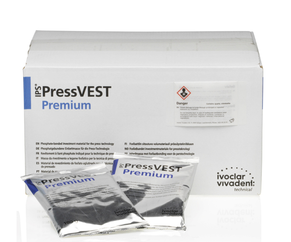 Universal phosphate coating for injection materials. In addition to its use for individual restorations, bridges, and hybrid abutments, it can be used for Press on techniques on metal and ZrO2. Compatible with Speed or conventional techniques, its high stability during preheating allows it to be used with materials that have different coefficients of expansion. Ideal for objects printed or milled in wax. Its fine and dense consistency provides high-quality results and smooth, homogeneous surfaces. Injected restorations coated with IPS PressVest Premium exhibit a minimal reaction layer that is very easy to remove. This coating is characterized not only by its universality but also by its high affinity for details and impressive fit results. Used in ceramic injection processes such as: IPS e.max Press, IPS e.max ZirPress, and IPS InLine Pom. High strength and stability, minimal and easily removable reaction layer, suitable for conventional or Speed techniques, exact fit, and excellent surface quality, universal coating for ceramic injection techniques, mixed in a short time with good flow, and convenient creamy consistency of the mixture.