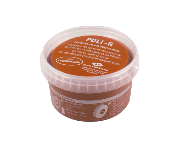 Poli-R is a gel designed for polishing and shining all types of acrylic resins in a single operation. It can be applied using either felt cones or brushes. It offers high polishing speed with low environmental powder content.