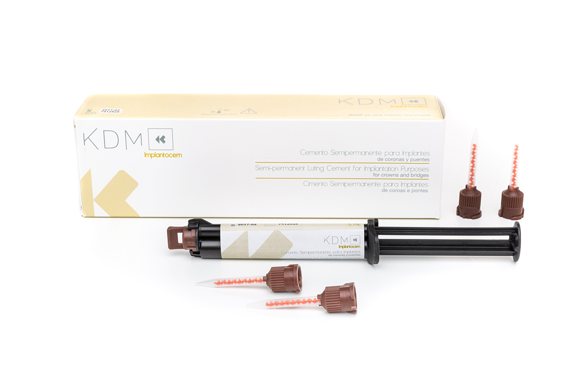 KDM IMPLANTOCEM SEMI-PERMANENT CEMENT FOR IMPLANTS. KDM IMPLANTOCEM IS SUITABLE FOR SEMI-PERMANENTLY CEMENTING CROWNS AND BRIDGES TO THE IMPLANT ABUTMENT. IT SHOWS GOOD ELASTICITY AND A GOOD SEAL DUE TO CONTROLLED LIGHT EXPANSION. KDM IMPLANTOCEM IS SUPPLIED IN 4:1 MINIMIX SYRINGES.
