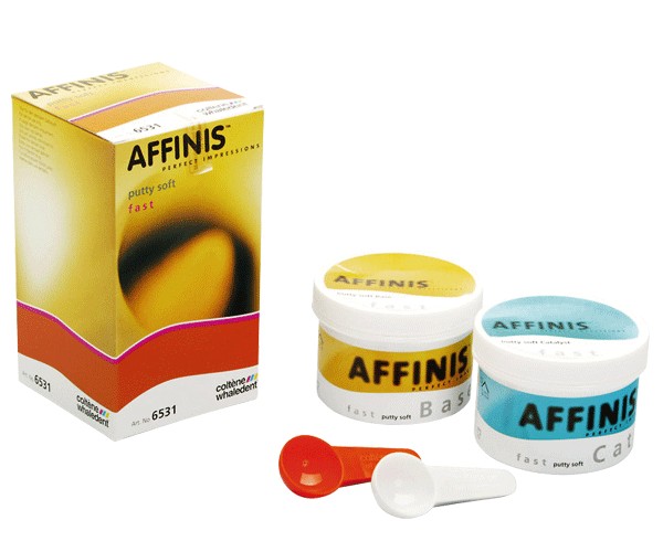 Affinis is an A-type silicone with a surface affinity and ideal viscosity properties: - Its rapid and unique affinity with the moist structure allows it to flow like a hydrocolloid, reaching the most critical areas without the need to apply any pressure with the tray material. - The special combination of additives creates minimal resistance to viscosity (self-adapting consistency), preventing air entrapment while the material is sufficiently thixotropic to avoid dripping outside the preparation.