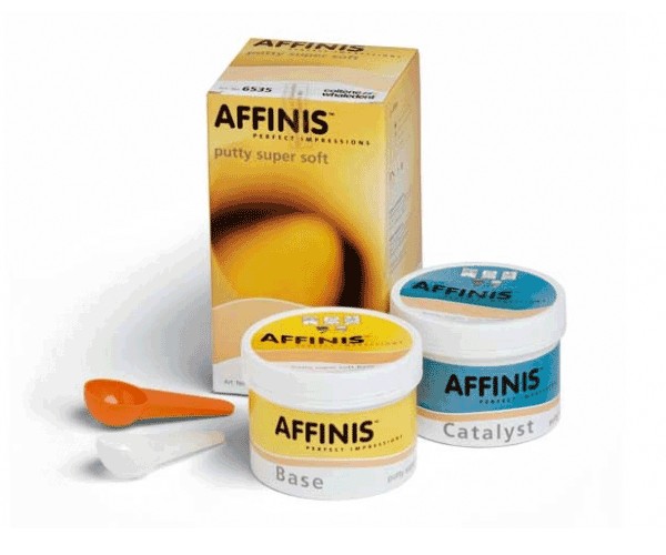 Affinis is an A-type silicone with a surface affinity and ideal viscosity properties: - Its rapid and unique affinity with wet structures allows it to flow like a hydrocolloid, reaching the most critical areas without the need to apply any pressure with the tray material. - The special combination of additives creates minimal resistance to viscosity (self-adapting consistency), preventing air entrapment while the material remains sufficiently thixotropic to avoid dripping outside the preparation.