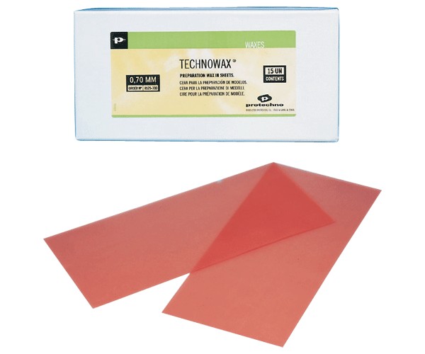 Relief wax for model preparation. Red. Box of 15 sheets, 170 x 80 mm, and 0.7 mm thick.