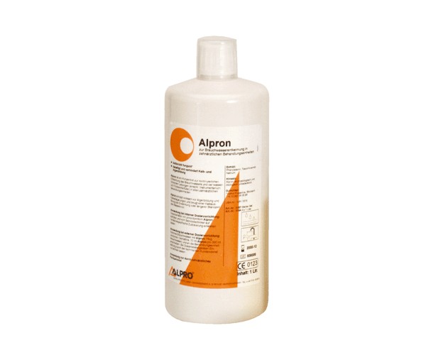 Liquid concentrate for optimal water hygiene in dental units. Alpron decontaminates water (bactericidal/fungicidal) and exhibits a lasting disinfectant effect. Alpron prevents the formation of germs, avoids limescale deposits, and is highly compatible with materials.