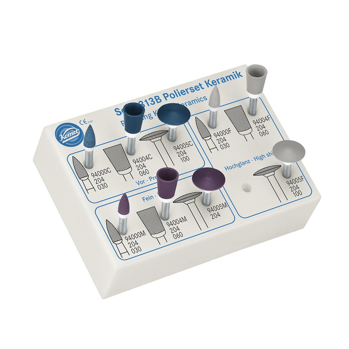 Bur for ceramic polishing. Contains 9 polishers in small flame, cup, and lentil shapes, with coarse, medium, and fine grits.