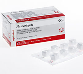 Resorbable hemostatic sponges made of native undenatured collagen. No contraindications or side effects.