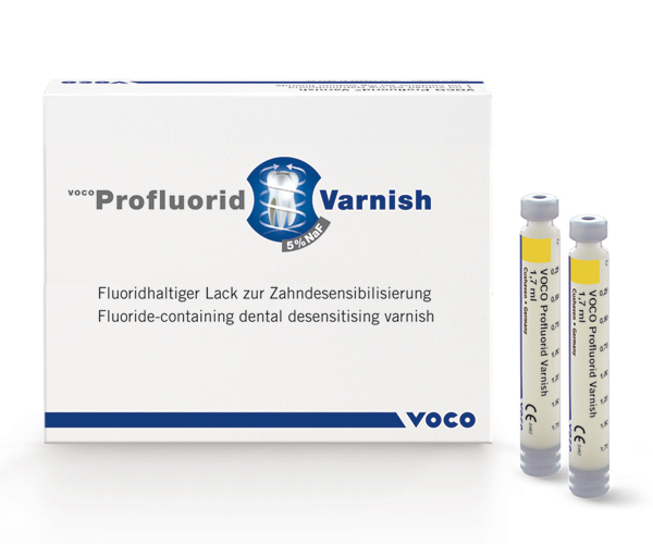 Fluoride varnish for tooth desensitization. Tooth-colored varnish with excellent adhesion, even to moist dental surfaces.