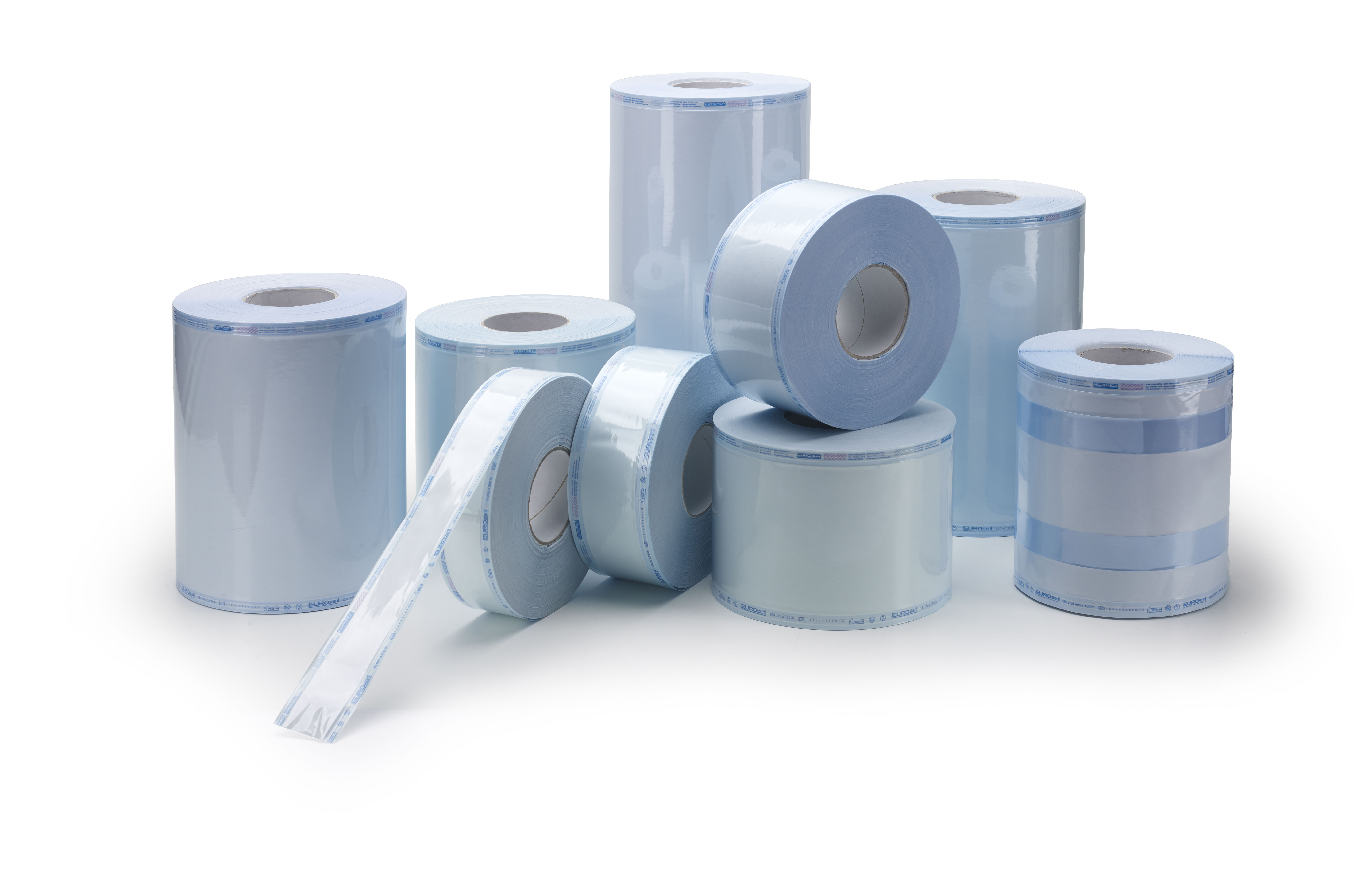 Roll for sterilization made of high grammage medical paper (60g/m²) and double layer of light blue film in polystyrene/polypropylene. Three lateral seals with waterproof and homogeneous channels for maximum microbial protection. Equipped with chemical indicators for steam or EtO gas (ethylene oxide) sterilizations. Suitable peelability without releasing paper fibers or tearing the paper when opening the package. Fully compliant with Directive 93/42/EEC (and subsequent amendment 2007/47/EC) and standard EN-868-1.